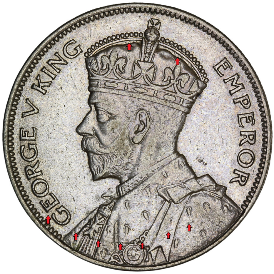 1934 – HalfCrown – Die Crack – Torn Robe – Type 1 – Die Clash Detail in Crown – 2_resize ← Previous Next →
