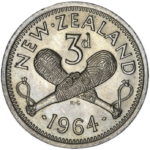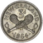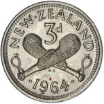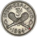 Die Clash more obvious on the Obverse showing the outline of the Patu . This fault often starts with a obvious line under the Queens Ear that is present on a number of years but this is only the second 1964 coin I have found to show this extent of a die clash.