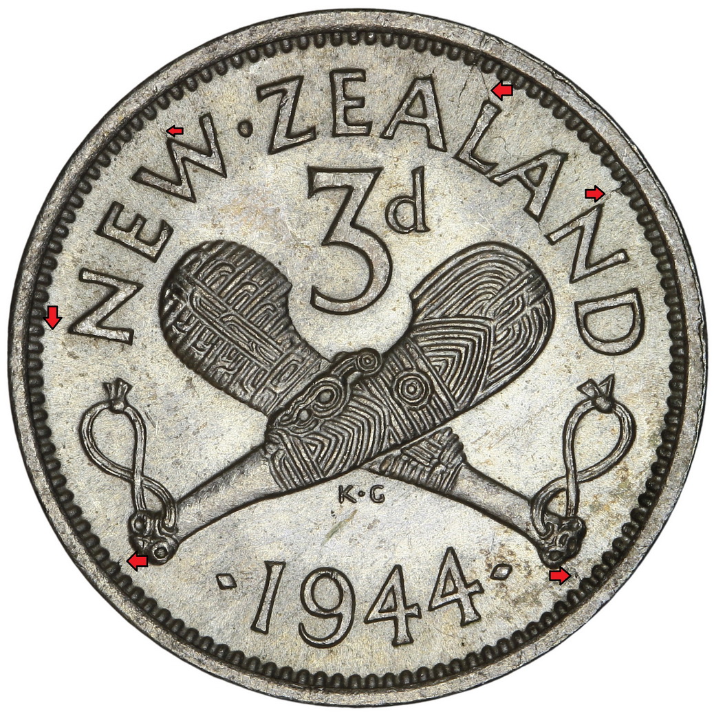 1944 – 3d – Both Patu – N + W of New – L + N of Zealand – E of George – P O of Emperor + Die Crack to neck – 1_resize ← Previous Next →